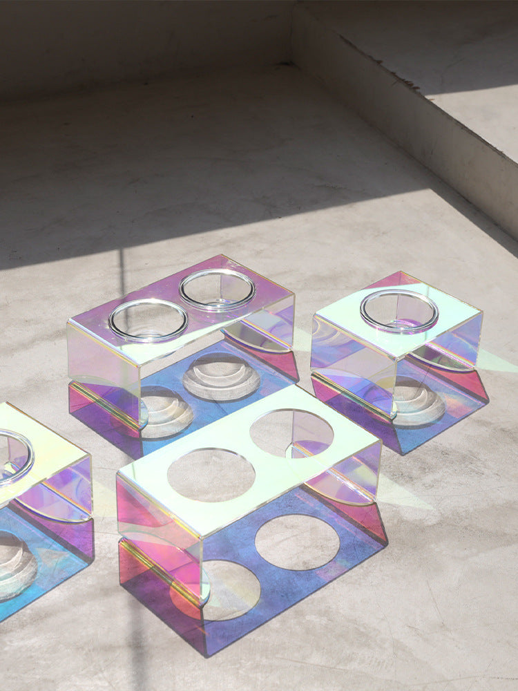 This colorful acrylic pet bowl adds a fun touch to your space while keeping mealtime tidy. Made from shiny holographic acrylic, it’s easy to clean and stays put with anti-slip rubber feet. Perfect for cats and small dogs!